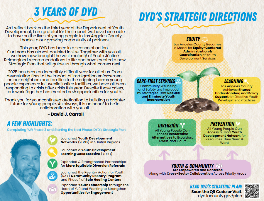 The Los Angeles County Department of Youth Development (DYD) represents a historic investment in youth wellbeing and development, with a focus on young people and communities who have been impacted by structural racism, poverty, and criminalization.